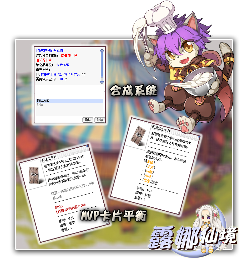 二、新增神职、锻造、合成、进化、强化系统。原创神职系统,引入第二职业,让玩家有了新的突破点,乐趣更多;新设锻造系统,使得每件装备都有变成独一无二的可能性;新设合成系统,开放全部MVP卡片和神器,物品登场率达99%;新设进化系统,让装备有了进一步升级的可能性;新设强化系统,从此之后,没有低价值的卡片。