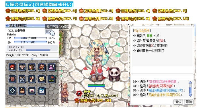 7、多玩RO专属VIP 至尊会员身份 彰显会员身份,显示在名字下方。提升VIP等级可获得奖励VIP特权礼包