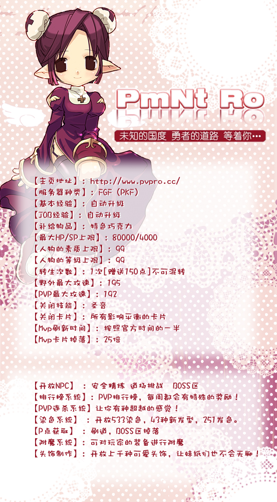 PmNt.Ro玩家交流群:92820197 【主页地址】:http://www.pvpro.cc/ 【帐号注册】:http://www.pvpro.cc/ 【服务器种类】:FGF(PKF) 【基本经验】:自动升级 【JOB经验】:自动升级 【补给物品】:特色巧克力 【最大HP/SP上限】:80000/4000 【人物的素质上限】:99 【人物的等级上限】:99 【转生次数】:1次[赠送150点]不可混转 【野外最大攻速】:195 【PVP最大攻速】:192 【关闭技能】:圣音 【关闭卡片】:所有影响平衡的卡片 【普通装备掉落】:商店街出售 【普通卡片掉落】:商店街出售 【Mvp刷新时间】:按照官方时间的一半 【Mvp卡片掉落】:25倍